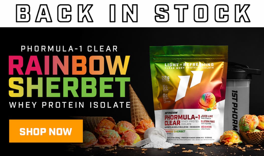 Bright citrus, sweet berry, with a smooth & fruity finish you wouldn't expect from a protein shake. Rainbow Sherbet Phormula-1 Clear is a light, crisp, juice-like protein that will send you back to your childhood with every sip. ...and it's Back in Stock! | | With 22g of high-quality & refreshing protein in every scoop... This crave-worthy flavor will be a staple in your post-workout routine, or a sweet treat throughout the day! | | | | |