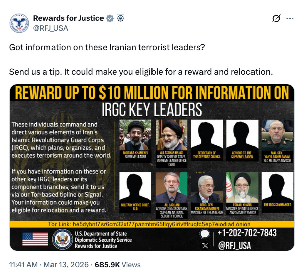 Help us defeat and replace the mainstream media! Become a PolitiBrawl paid subscriber today:State Department offers $10M, US residency for tips on whereabouts of 10 Iranian leadersThe State Department announced Friday that Iranian citizens can earn up to $10 million and the ability to move to America if they inform on the whereabouts of 10 senior Islamic Republic leaders described as “key leaders” of the Islamic Revolutionary Guard Corps, which the US labels a terrorist group. People with knowledge can share information via a Tor browser tip line or the secure Signal messaging app.