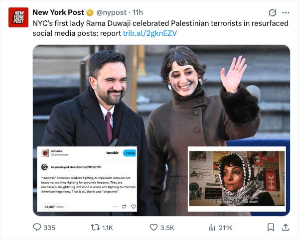 NYC Mayor Mamdani’s wife celebrated Palestinian plane hijacker, terrorist group in resurfaced social media postsNYC First Lady Rama Duwaji, 28, used her Tumblr account to hail Palestinian plane hijacker Leila Khaled and members of terror group Popular Front for the Liberation of Palestine while living in the Middle East, according to posts reviewed by the Washington Free Beacon. In September 2017, she posted a photo of Khaled—who took part in plane hijackings in 1969 and 1970—with a caption quoting her line “if it does good for my cause, I’d be happy to accept death,” then shared an image of a Bangladeshi stamp reading “we salute the valiant freedom fighters of Palestine.”